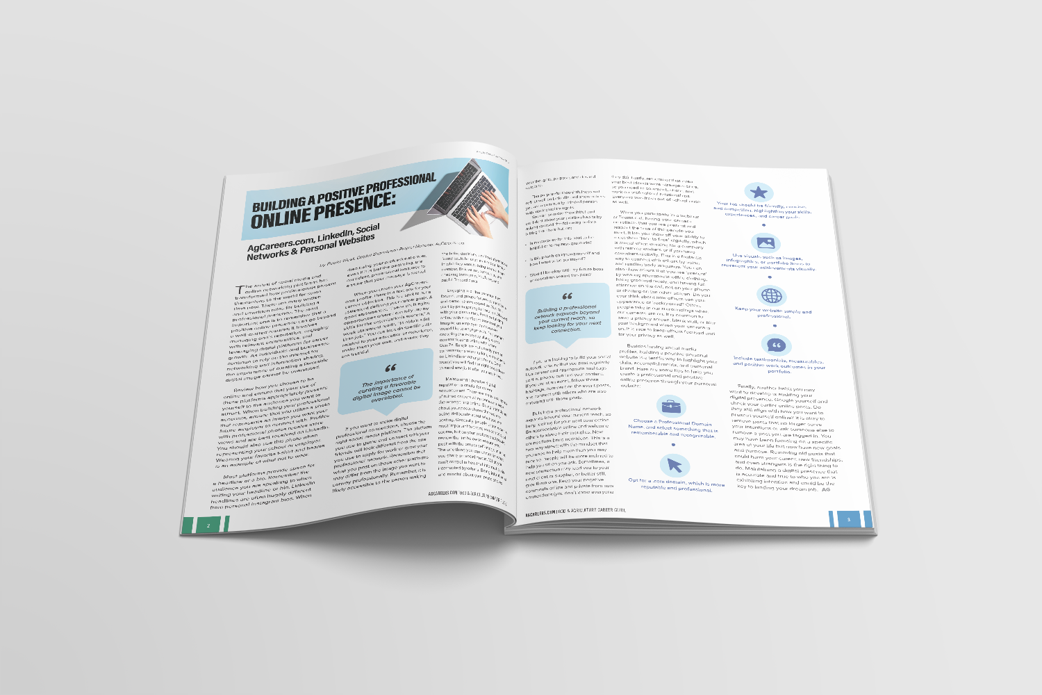 The AgCareers Food & Agriculture Career Guide is a yearly publication for students aimed at facilitating connections with career education resources and leading agriculture and food employers. The challenge was to lead a team of designers to create an eye-catching design that conveys the diversity of the industry and visually aids the ultimate goal of providing job seekers with career advice.